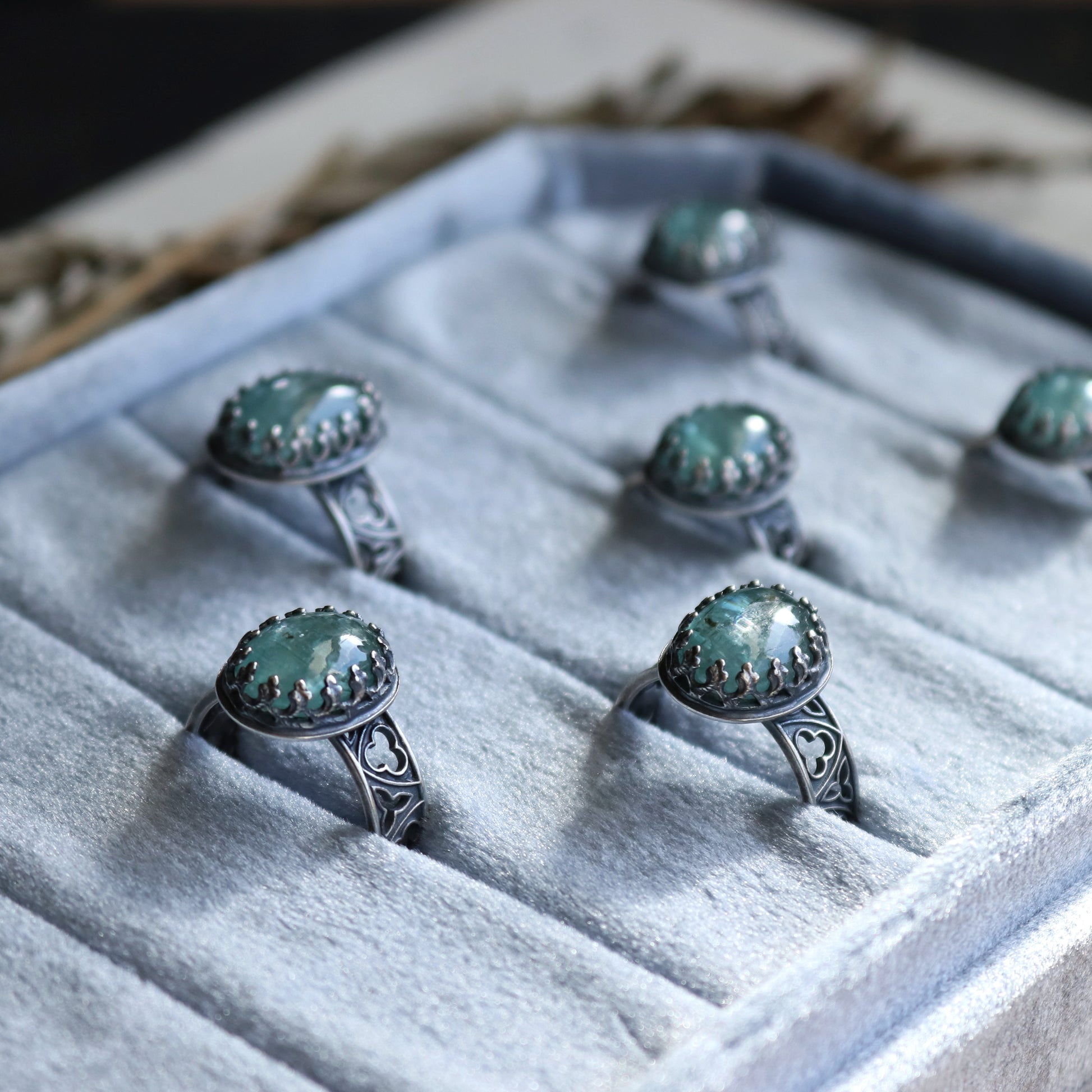 PRODUCT DIMENSIONS & SPECS: Limited Ring quantities available. Cathedral rings featuring beautiful Aqua Kyanite gemstones.