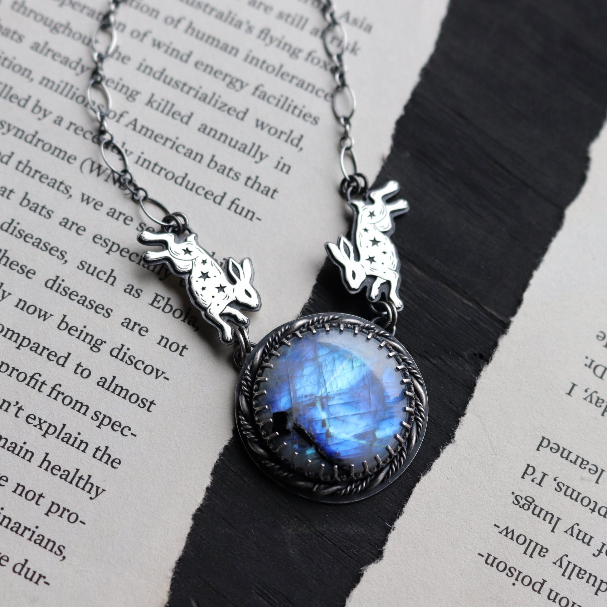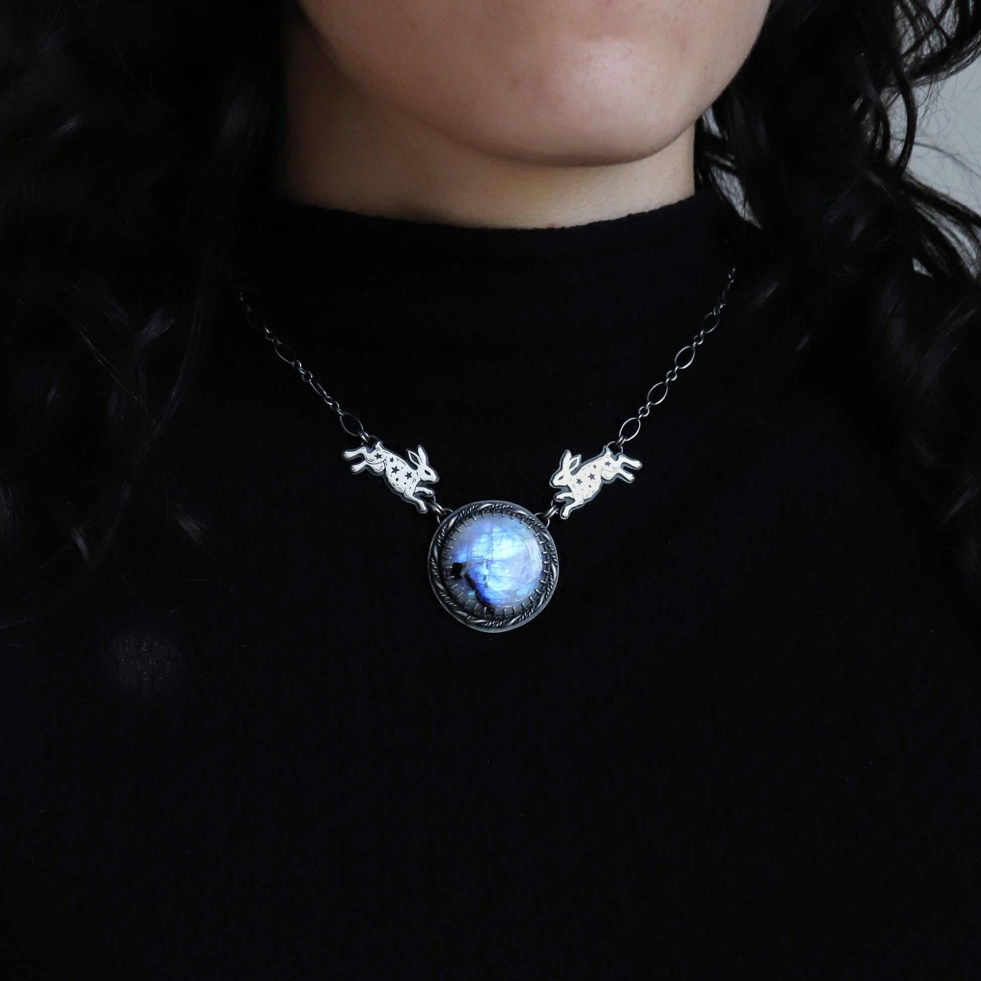 PRODUCT DIMENSIONS & SPECS: Pendant is about 3 inches in width and features a gorgeous Moonstone with tourmaline inclusions. Chain length set at an adjustable 14-16 inches.