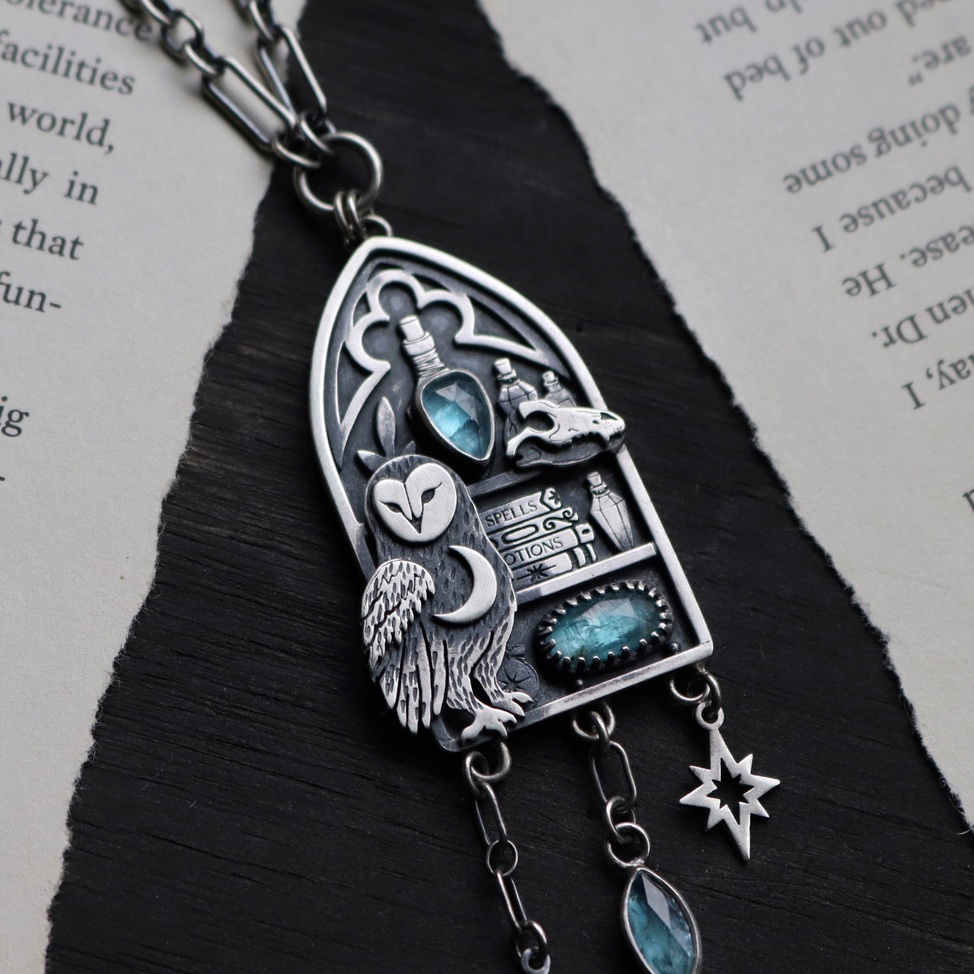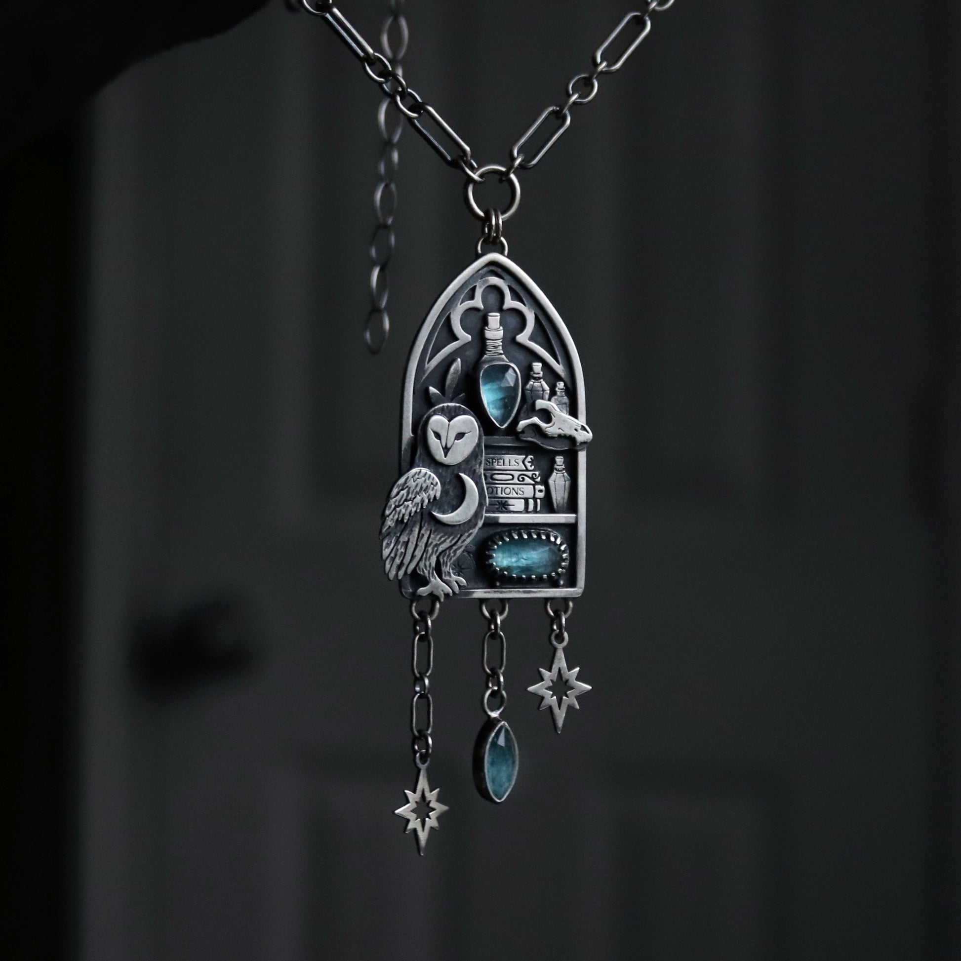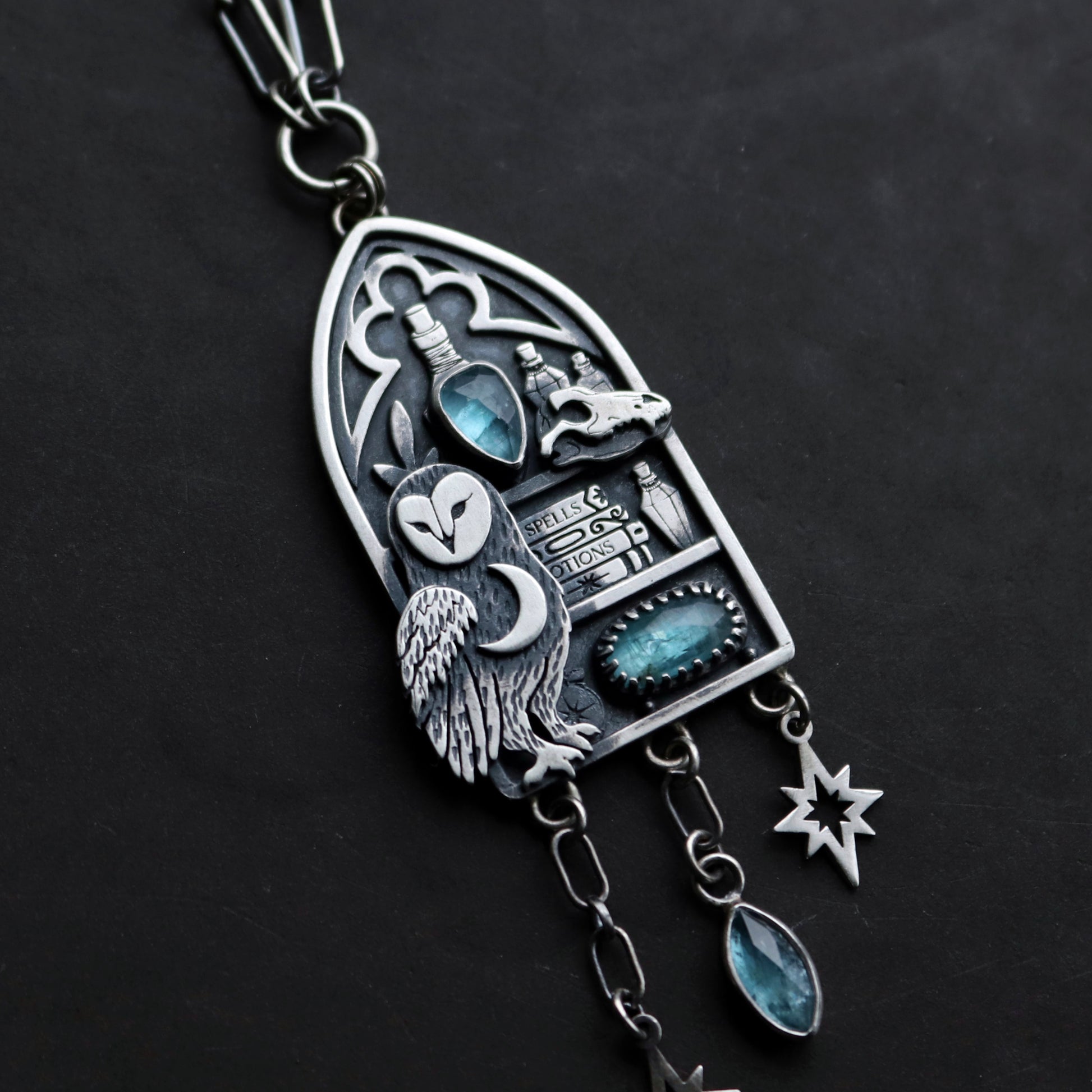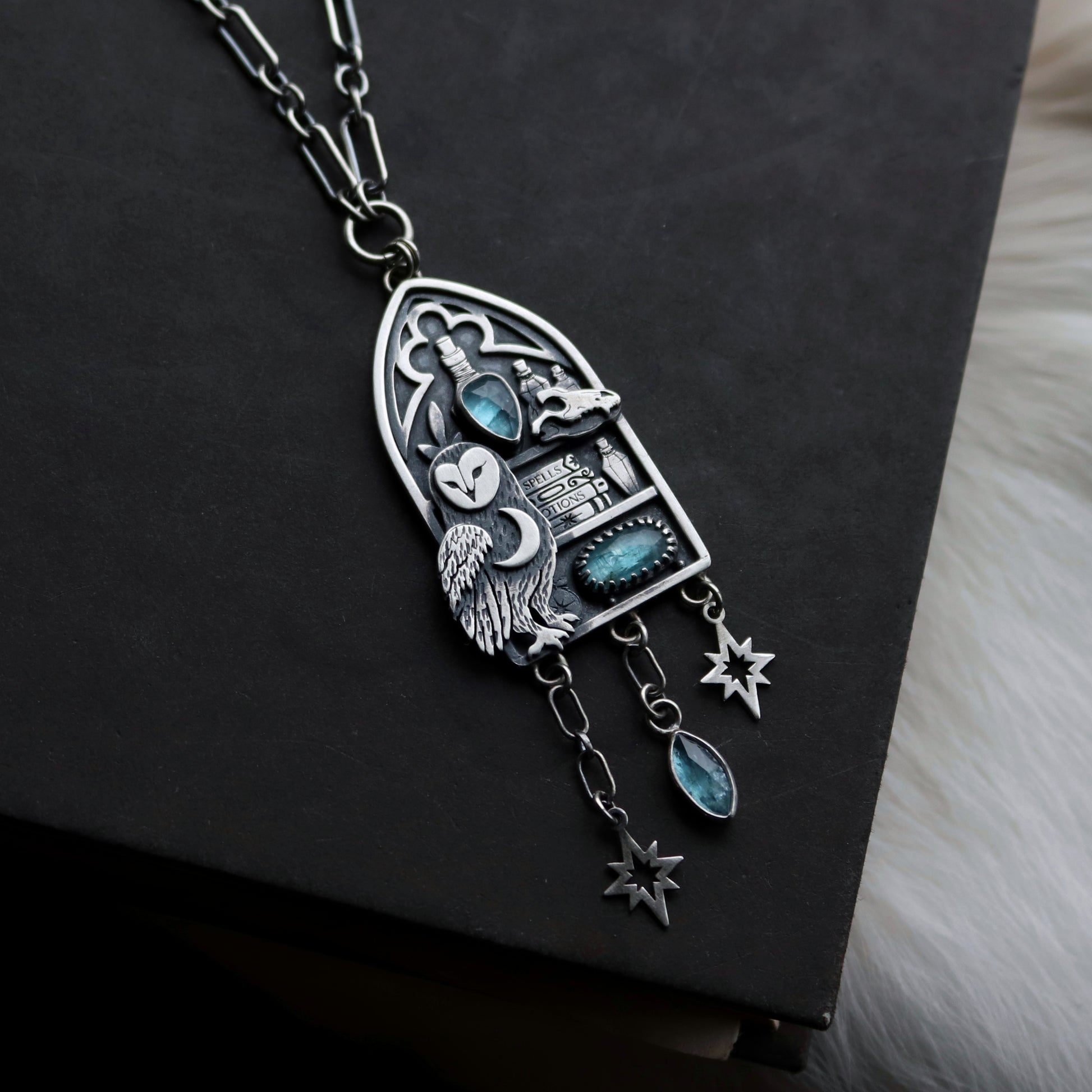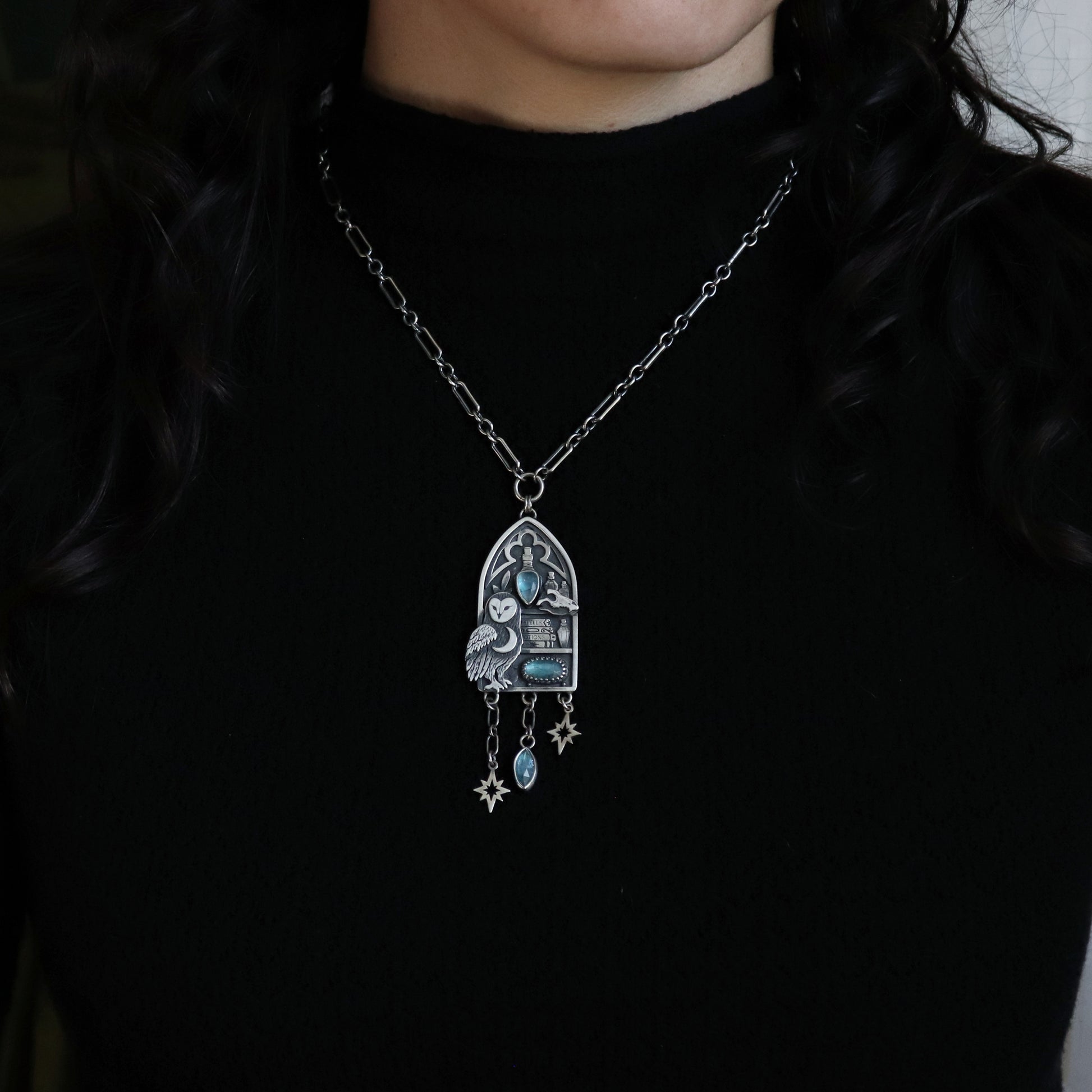 PRODUCT DIMENSIONS & SPECS: Pendant is about 3 inches in drop down length and features 3 kyanite gemstones. Chain length set at an adjustable 16-18 inches.