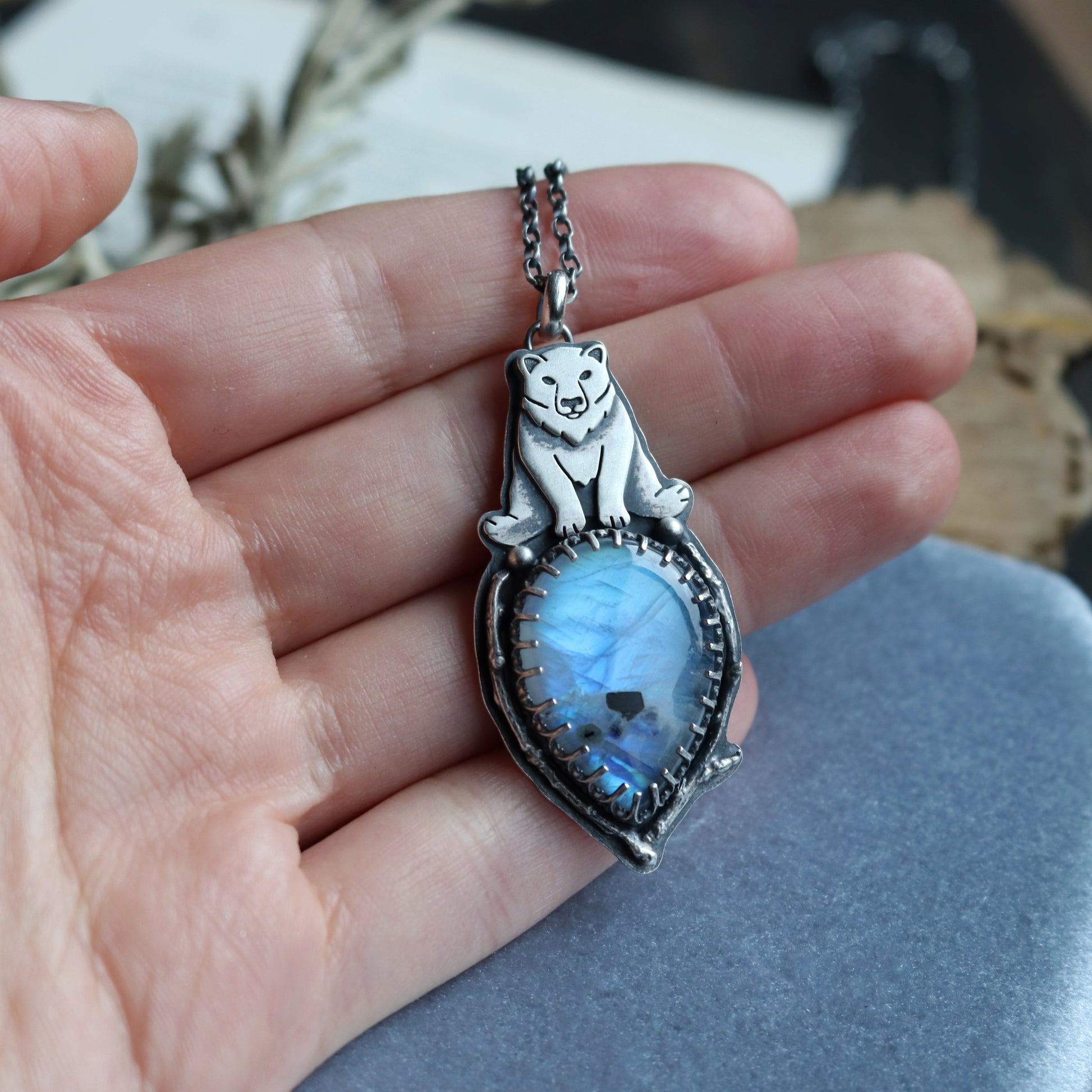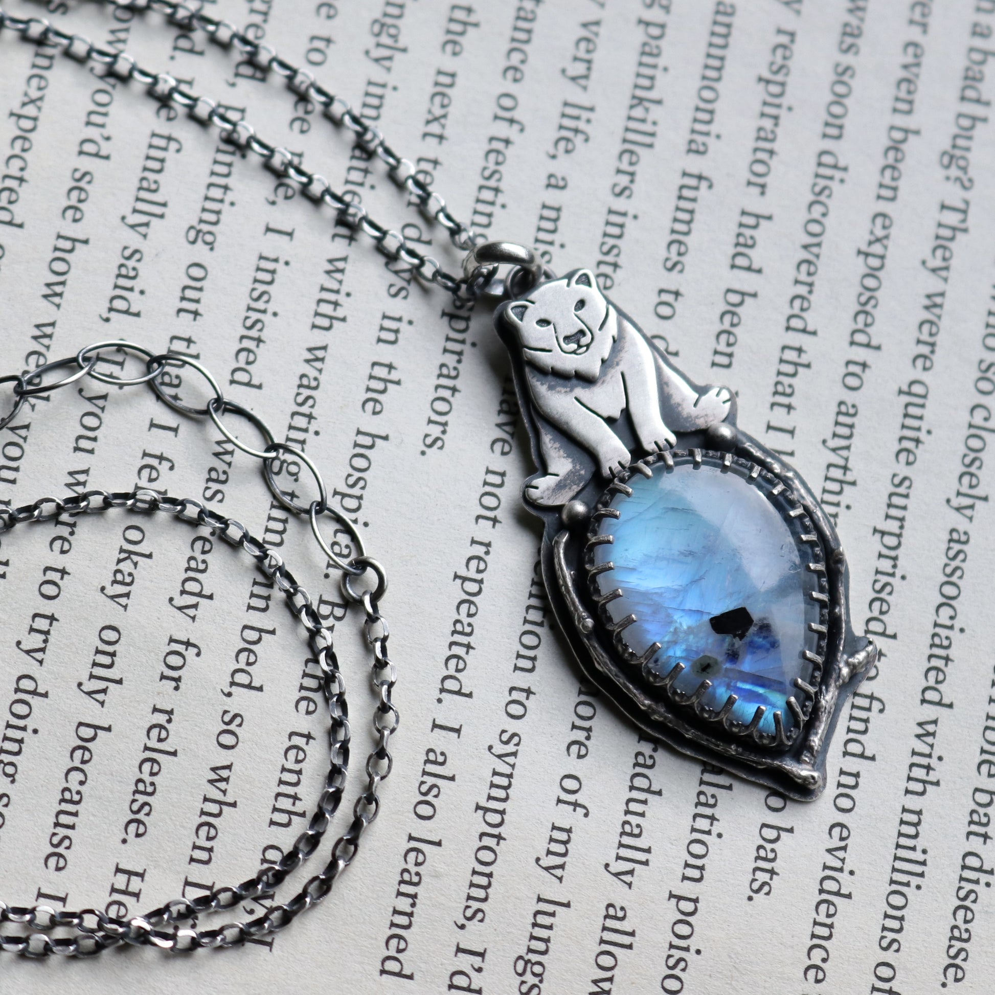 PRODUCT DIMENSIONS & SPECS: Pendant is about 2 inches in drop down length and features a moonstone gemstone with tourmaline inclusions. Chain length set at an adjustable 18-20 inches.