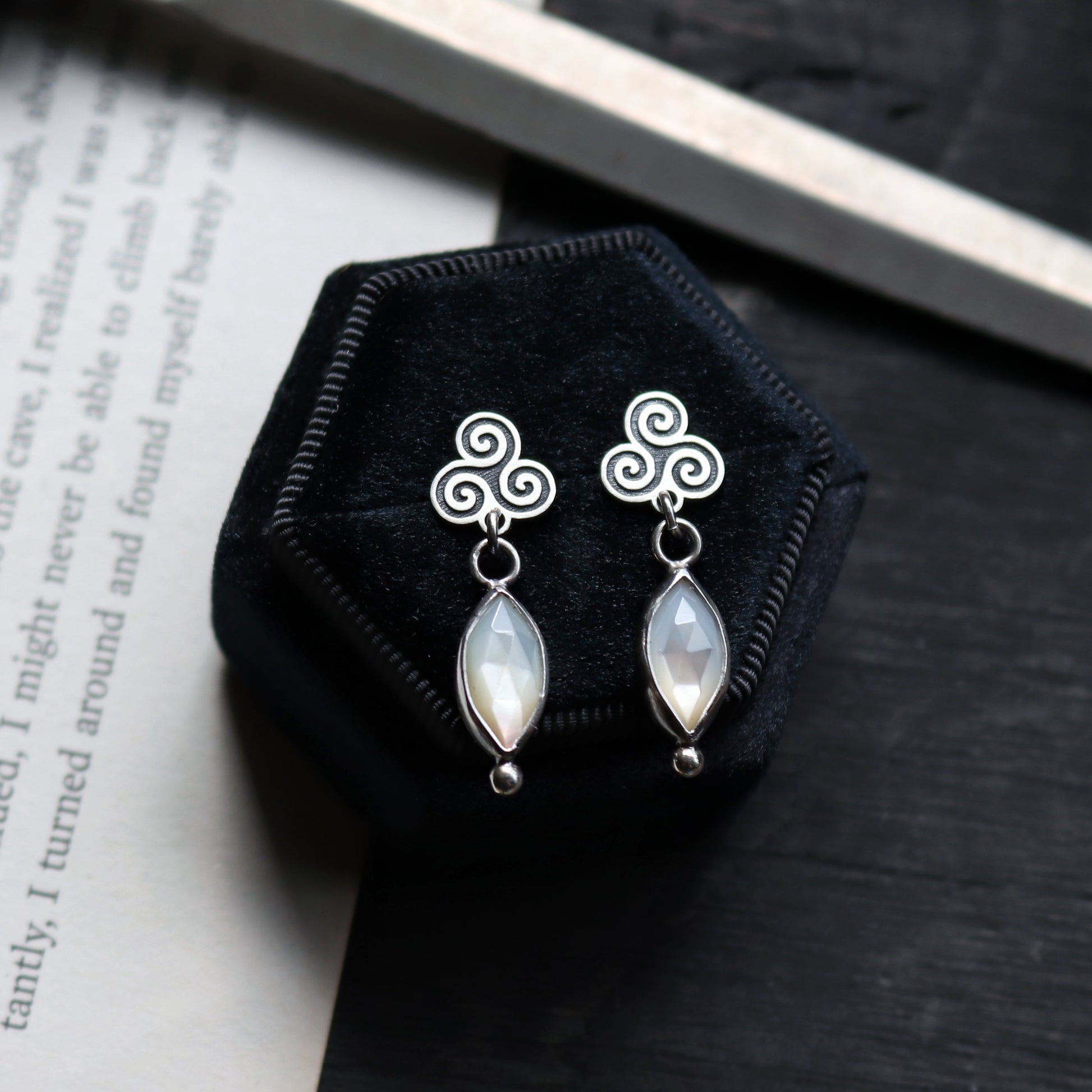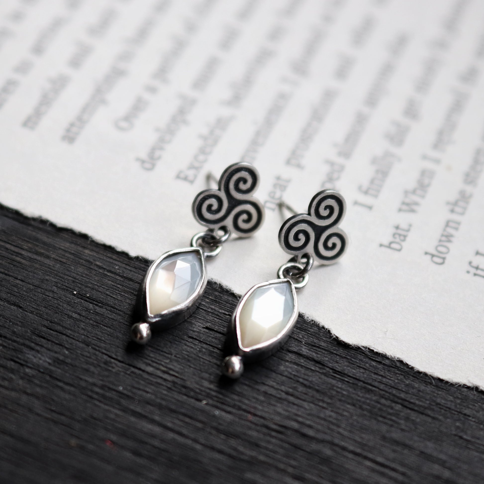 PLEASE NOTE: This listing is for (ONE PAIR) of Triple Spiral stud earrings with Mother of Pearl. Photo props are NOT included.